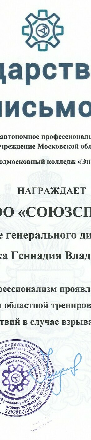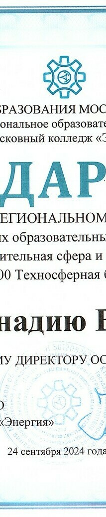 Благодарность от ГАПОУ "Подмосковный колледж "Энергия"
