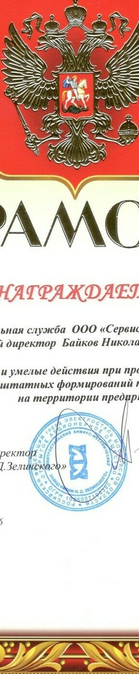 Грамота от ОАО "ЭХМЗ им. Н.Д. Зелинского"