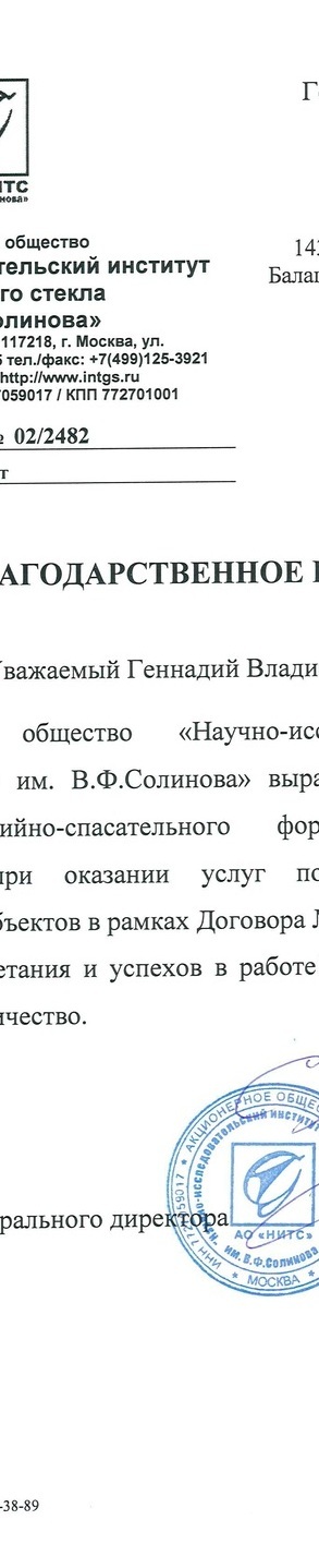 Благодарственное письмо от НИИТС им. В.Ф. Солинова